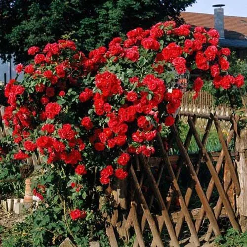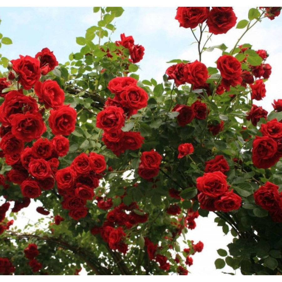 Взрослый куст вырастает до 5 метров, его диаметр может достигать 2 метров. Такой объемный куст может применяться для украшения забора, арки, стены. Поэтому при посадке необходимо подготовить устойчивую и крепкую опору. Цветки данного сорта обладают насыщенным алым цветом, их структуру можно сравнить с махрой, диаметр одного бутона достигает 10 см. Их аромат очень приятен. Растут цветы довольно плотно, каждый имеет по 20-25 лепестков.