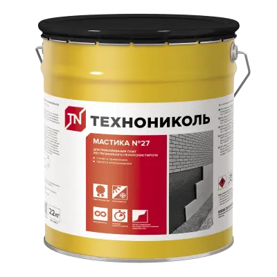 Данный состав разрабатывался компанией Технониколь для приклеивания плит ЭППС к вертикальным и отвесным основаниям. Мастика приклеивающая №27 в Москве используется в основном для утепления стен, а также для теплоизоляции фундаментов. Она создана на основе современного битумного материала, в который введены минеральные вещества, а также растворители и специальные добавки.