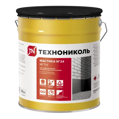 Мастика № 24 гидроизоляционная МГТН (Технониколь) поставляется в металлических евровёдрах объёмом, который вмещает 20 килограмм материала, хотя есть также фасовка по 10 кг и по 3 килограмма. Этот продукт не требует специальной подготовки перед применением, кроме разве что нагревания при выполнении работ в холодное время года. Вся эта сложная композиция доведена до нужной вязкости растворителем. В целом масса нелетучих соединений имеет долю на уровне 65 процентов от массы всего состава.