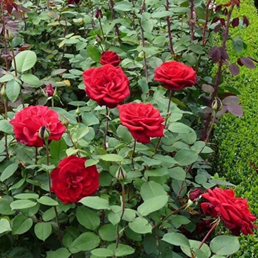 В период вегетации, на удлиненных цветоносах формируются шаровидно-удлиненные бутоны красно-черного окраса, которые распускаются крупными полумахровыми цветами – диаметр 8-10, иногда 12 см. Чашевидная роза с высоким центром характеризуется тугой структурой, состоящей из 25-30 одинаковых лепестков с матовым покрытием. Полностью раскрывшийся цветок выглядит очень эффектно – изюминкой является закручивание крайних лепестков наружу. Кроме того, запоминается сорт необычным окрасом роз – темно-красный, но внешняя сторона лепестков более светлая. Особый французский шарм цветку придает практически черный окрас отдельных нижних лепестков. Цветущий кустарник издает яркий и насыщенный аромат, в котором слышны сладко-фруктовые нотки.