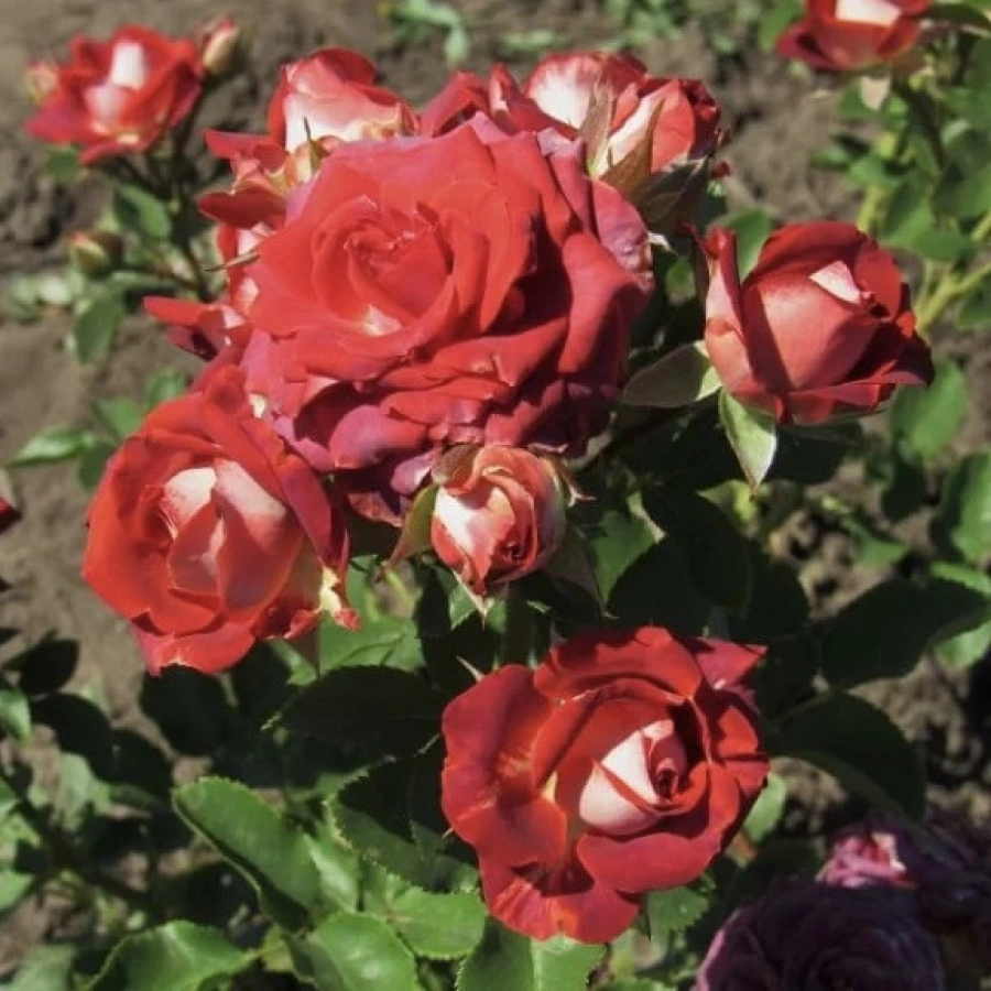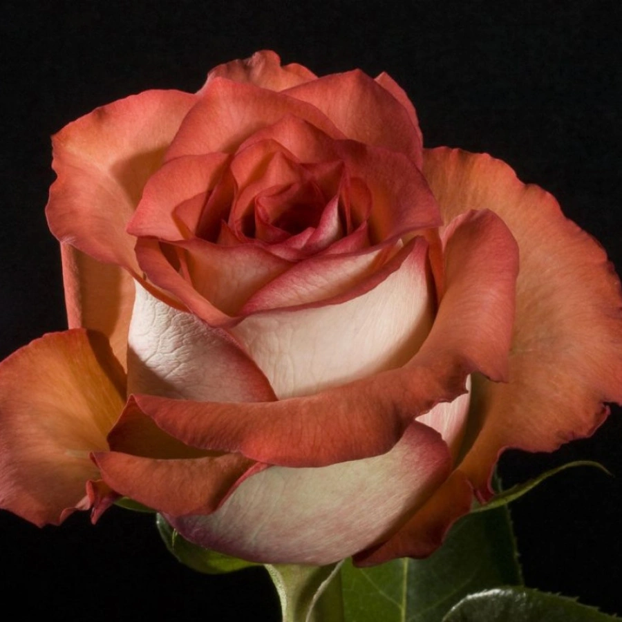 Цвет – биколор, с терракотово-красной внутренней стороной лепестков и бархатисто-белой наружной. Цвет почти коричневый. Лепестки к краям приобретают более насыщенный тепло-пурпурный тон, к центру лепестки более алые. Укладка лепестков элегантная, в меру свободная, край слегка бахромчатый, опаленный.