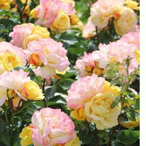 Сорт цветет в течение всего сезона довольно обильно начиная с середины июня по октябрь, демонстрируя двухцветный окрас соцветий сразу или меняя его во время цветения. Бутоны распускаются практически одновременно. Красивый куст с желто-розовыми бутонами способен стать настоящим украшением сада. Данный сорт может придать особое очарование любому ландшафтному стилю. Аккуратный куст лучше всего высадить на переднем плане миксбордера или клумбы.