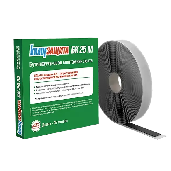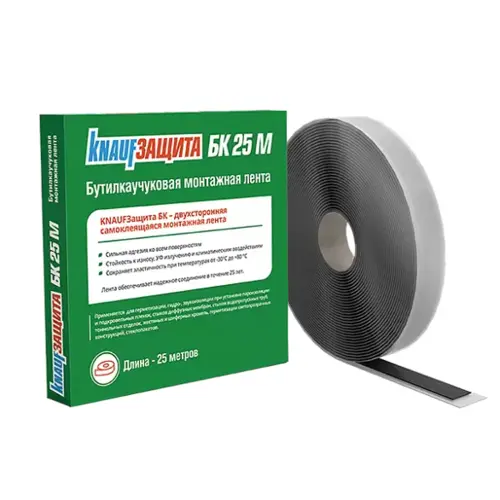 Бутилкаучуковая лента КНАУФ Защита — это двусторонняя монтажная лента, которая разработана для склеивания, гидро- и звукоизоляции, пароизоляционных плёнок и мембран, фиксации и герметизации стыков и швов в различных конструкциях. Обладает высокой адгезией как к ровным, так и шероховатым поверхностям: к дереву, бетону, металлу, а также к стеклу и пластику.