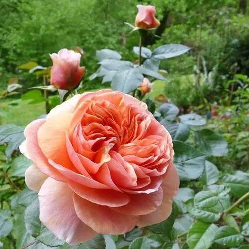 Цветки вырастают крупными, достигая 10-12 см в диаметре. Чашка сложена из 60-80 лепестков и относится к густомахровому типу. На стебле цветы располагаются одиночно и в соцветиях, до 3-х роз. От розочек исходит очень душистый персиково-манговый аромат.