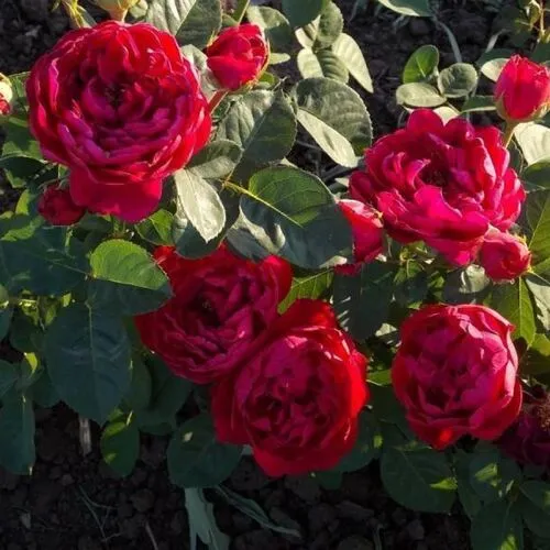 Бутоны окрашены в темно-красный тон, цветки светлее, но всегда яркие. Признаков двухцветности или пестроты нет. Бутон округлый, венчик плоскочашевидный. Цветки крупные, диаметром 12-13 см, густомахровые, в каждом по 100 лепестков. Аромат у этого сорта очень сильный, розовый, слегка пряный, с нотками аниса, малины и земляники.