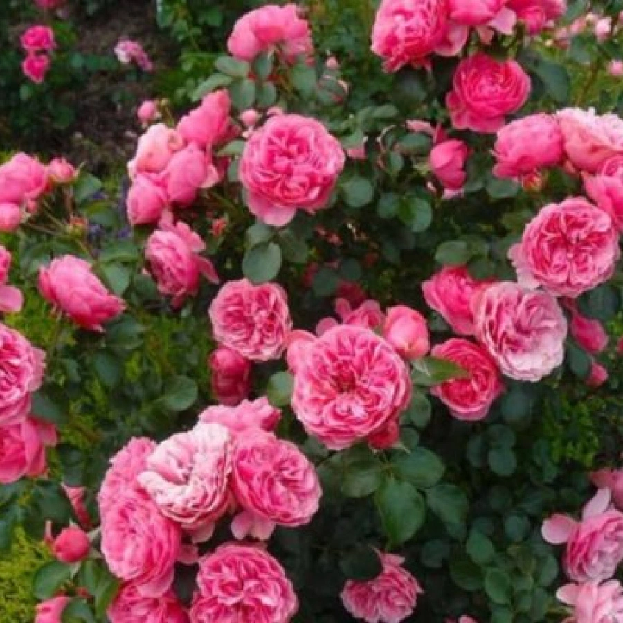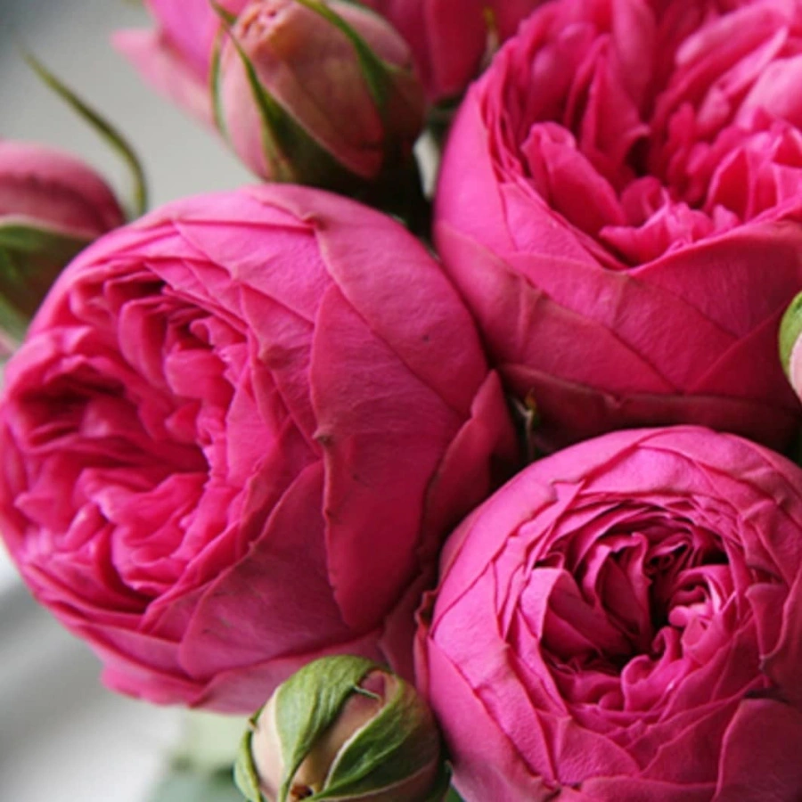 Бутоны розовых оттенков. Цветки средних размеров (6-8 см в диаметре), ярко-розовые, пионовидные, в полураскрытом виде шарообразные, а в распущенном состоянии – чашевидные, с большим количеством красиво оформленных лепесточков классической конфигурации. Тип цветков густомахровый. Растут они одиночно и в соцветиях. Количество цветков на одном стебле – 1-5 штук. Аромат по интенсивности слабый, но устойчивый, с тонким, пикантным малиновым оттенком, достигающий своего максимума в полуденное время. В срезке могут стоять длительное время.