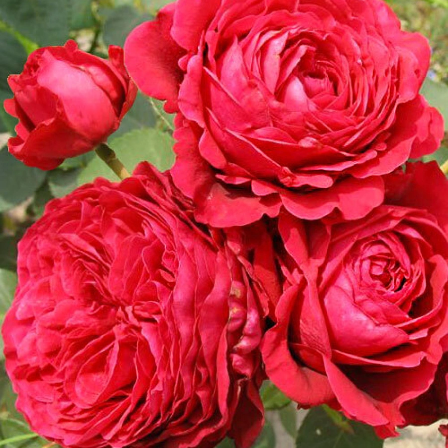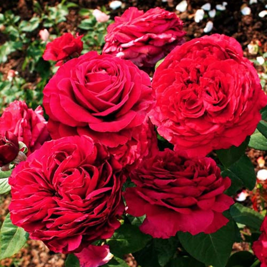 Мощный куст достигающий в высоту 80-100см., а в ширину 60-70 см. Листва тёмно зеленая, густая, именно поэтому куст устойчив в ветреную погоду. Сорт устойчив к заболеваниям и морозам. Цветет очень обильно, на протяжении всего летнего сезона. Окрас очень яркий карминно-красный. Цветки роскошные, крупные, густомахровые, романтической формы. Цветы неплохо переносят дождь. У них присутствует хорошо ощутимый фруктовый аромат с малиновыми и древесными нотками.