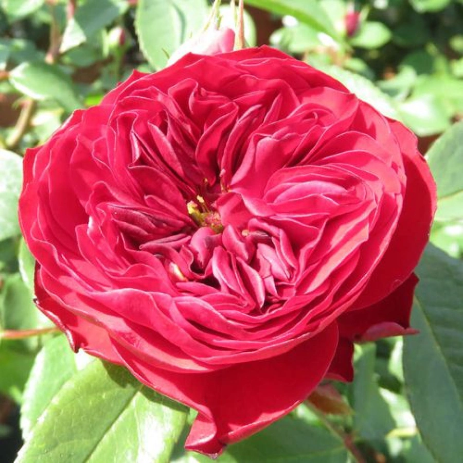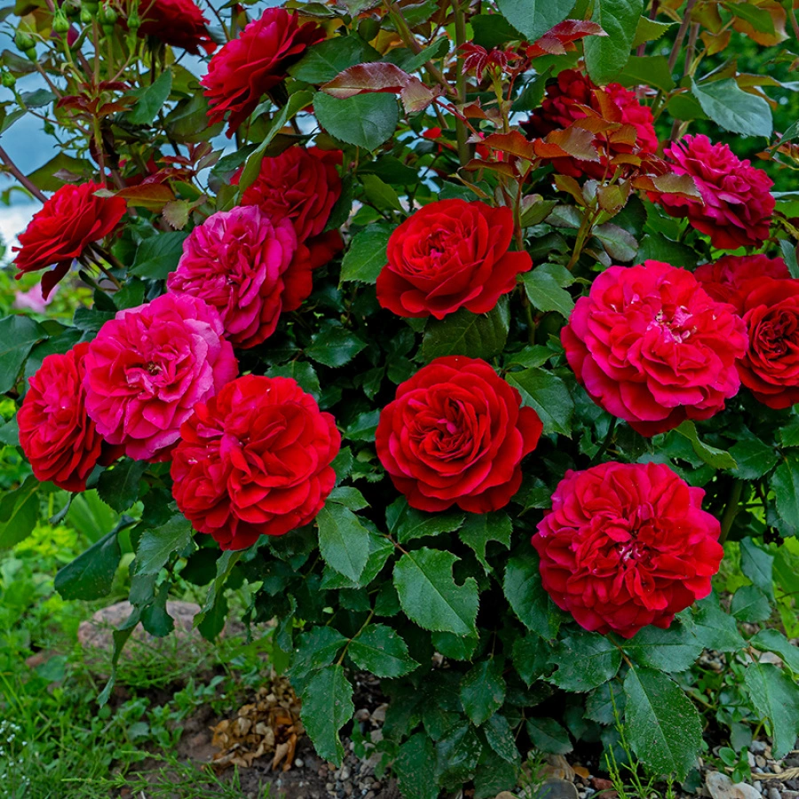 Бутоны бокаловидные, цветки розетковидные, диаметром 10-12 см, густомахровые, число лепестков 80-85, в центре квадратированные. Цветки ярко-красные, растут на ветке по 3-5 шт. В конце августа и осенью лепестки приобретают темные винные оттенки. Аромат нежный, вечером и в жару становится сильнее.