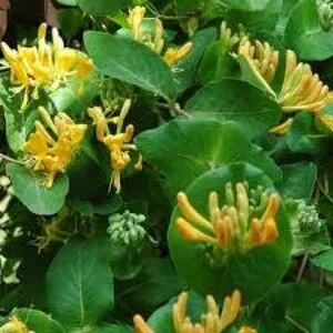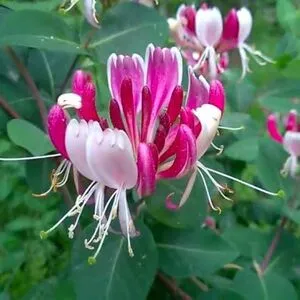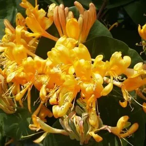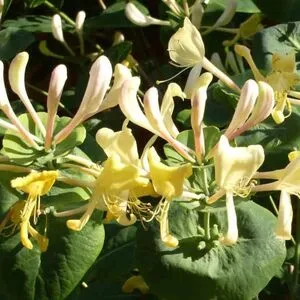 - Цветки: желтовато-белые, снаружи часто с красноватым оттенком, собраны в мутовки в пазухах верхних сросшихся листьев. Венчик 4–5 см длиной, двугубый. Цветки душистые, их аромат усиливается к вечеру. Период цветения — с мая по июль.