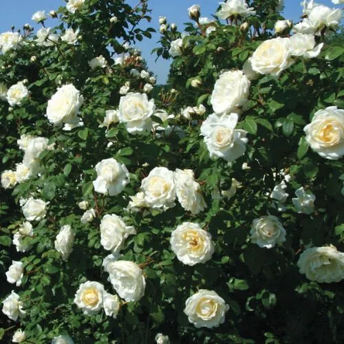 Цветок отличается обильным цветением красивыми цветочными кистями. Доминирующий окрас – белый, с присутствием сливочных тонов. Диаметр махрового бутона – до 12 сантиметров, а в кистях сидит до 5 цветков. Основное цветение продолжается до 8 дней, после чего цветок постепенно начинает увядать. Но цветение куста продолжается до осенних холодов. Цветочная культура прекрасно идет не только на срезку, но и активно используется в ландшафтном дизайне. Штамбовую форму применяют для создания живых изгородей, для декорации беседок и арок, для выращивания на клумбах и в контейнерах групповыми и одиночными посадками.