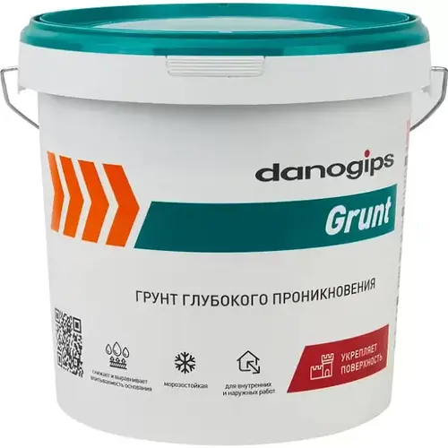 Грунт глубокого проникновения Danogips Grunt предназначен для обработки всех типов впитывающих поверхностей: бетонных, газобетонных, оштукатуренных, деревянных. Используется перед нанесением штукатурки, напольных смесей, плиточных клеев, красок и т.д. Подходит для наружных работ, потому что имеет характерный запах.