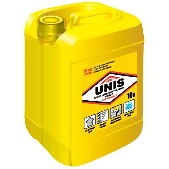 Для подготовки поверхностей помещений с нормальной влажностью. Фасовка 10 л. Преимущества грунтовки акриловой "ЮНИС Грунт ВР" Экономит расход дорогих отделочных материалов. Повышает долговечность отделки. Увеличивает прочность сцепления с поверхностью.