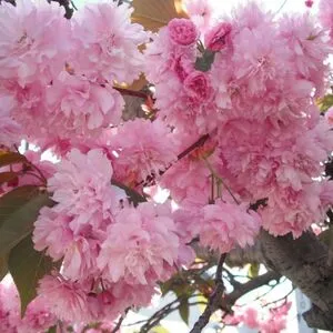 - Цветение происходит до (или в процессе) появления листьев, в это время деревья приобретают декоративный вид, покрываясь множеством белых или розовых распускающихся махровых цветков.