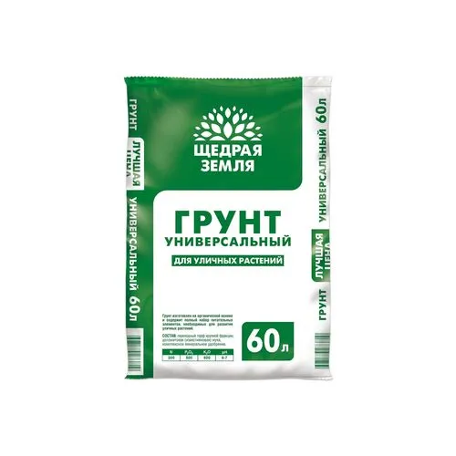 Грунт универсальный Щедрая земля - полностью готовый к применению универсальный питательный грунт, содержащий оптимальный набор питательных веществ в легкодоступной форме, необходимых для полноценного роста и развития всех видов садовых, огородных и декоративных растений. Преимущества: Не содержит возбудителей болезней, семян сорняков, токсичных веществ.
