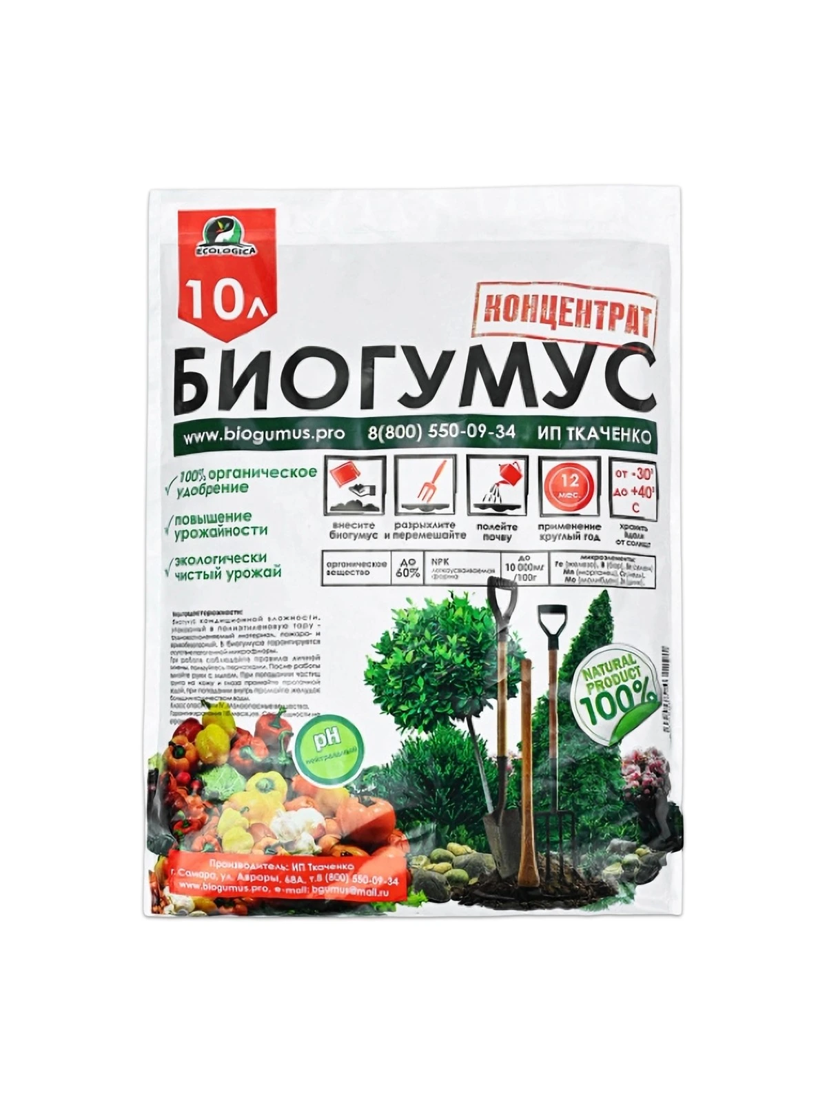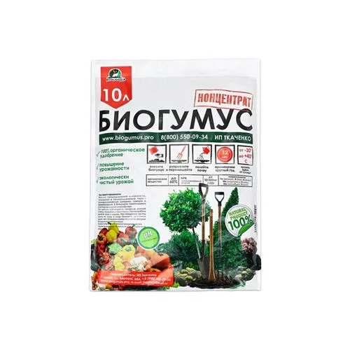 При использовании Биогумуса мы даем гарантию получения экологически чистого урожая. Биогумус совершенно безвреден на любых почвах, и, более того, может использоваться как самостоятельный грунт. Испытания показали, что Биогумус в 10-15 раз эффективнее любых известных органических удобрений. Положительный эффект от него может наблюдаться до 5 лет.