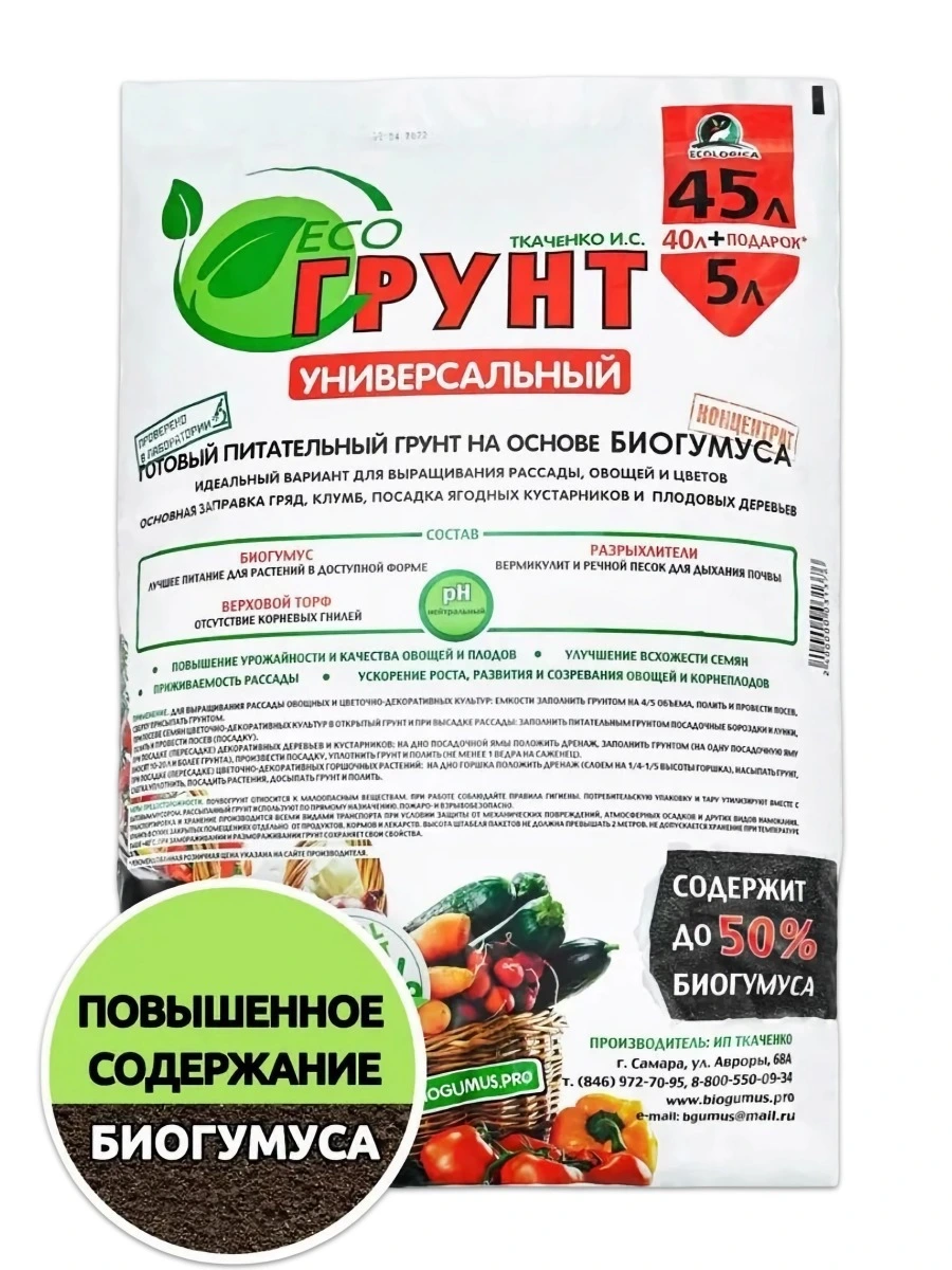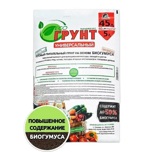 Продукт премиум класса. 100% натуральные компоненты. Полностью готовый к применению универсальный грунт на основе Биогумуса и верхового торфа, вермикулита и других природных материалов. pH: нейтральный