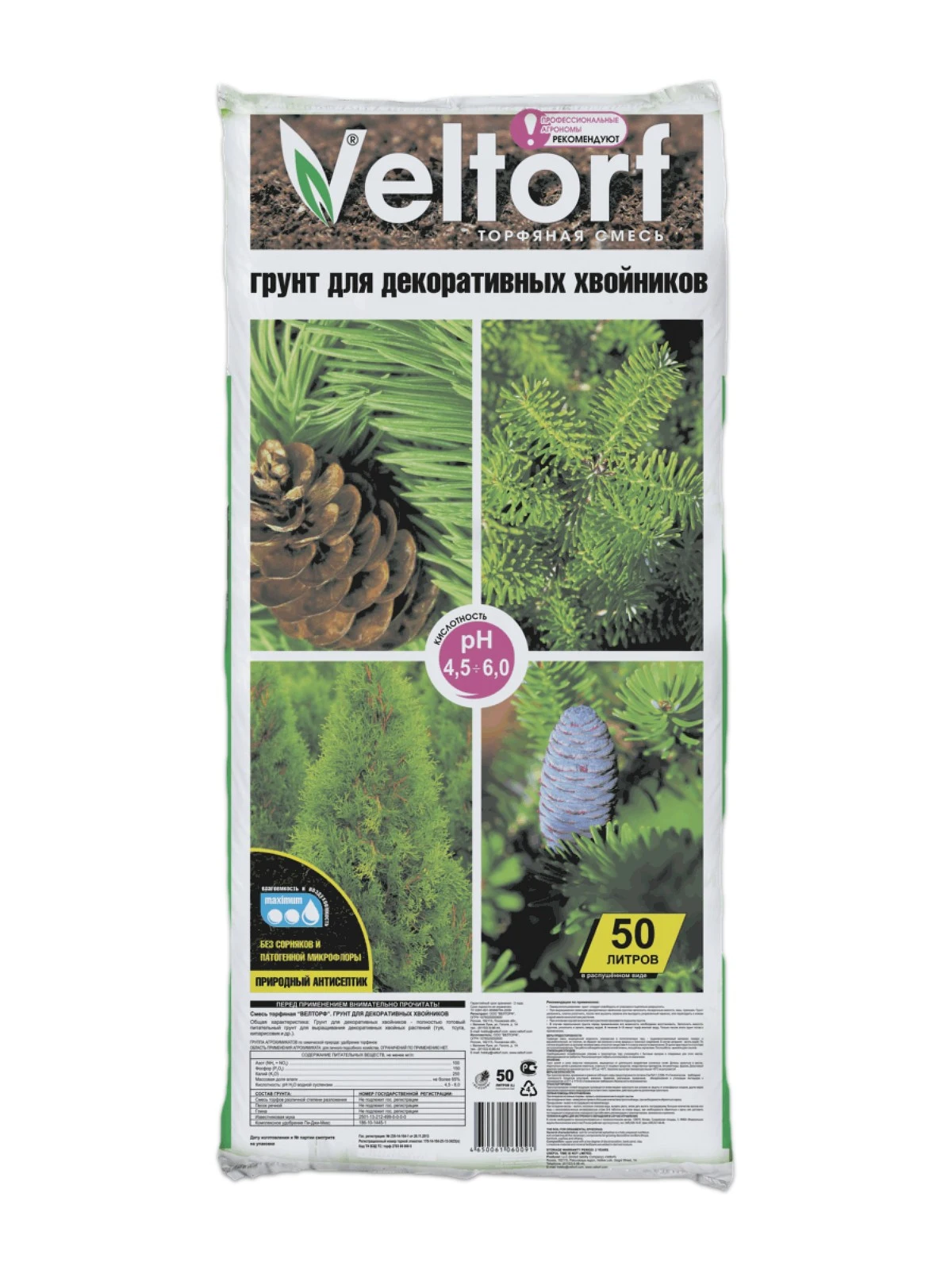 Грунт Veltorf для декоративных хвойников 50 л производится из фрезерного и низинного торфа различной фракции с небольшим добавлением песка и глины известняковых материалов и минеральных макро- и микроудобрений. Полностью готовый питательный грунт для выращивания декоративных хвойных растений. Подходит для молодняка и взрослых растений, используется в качестве подкормки. Является природным антисептиком, не содержит сорняков и патогенной микрофлоры.