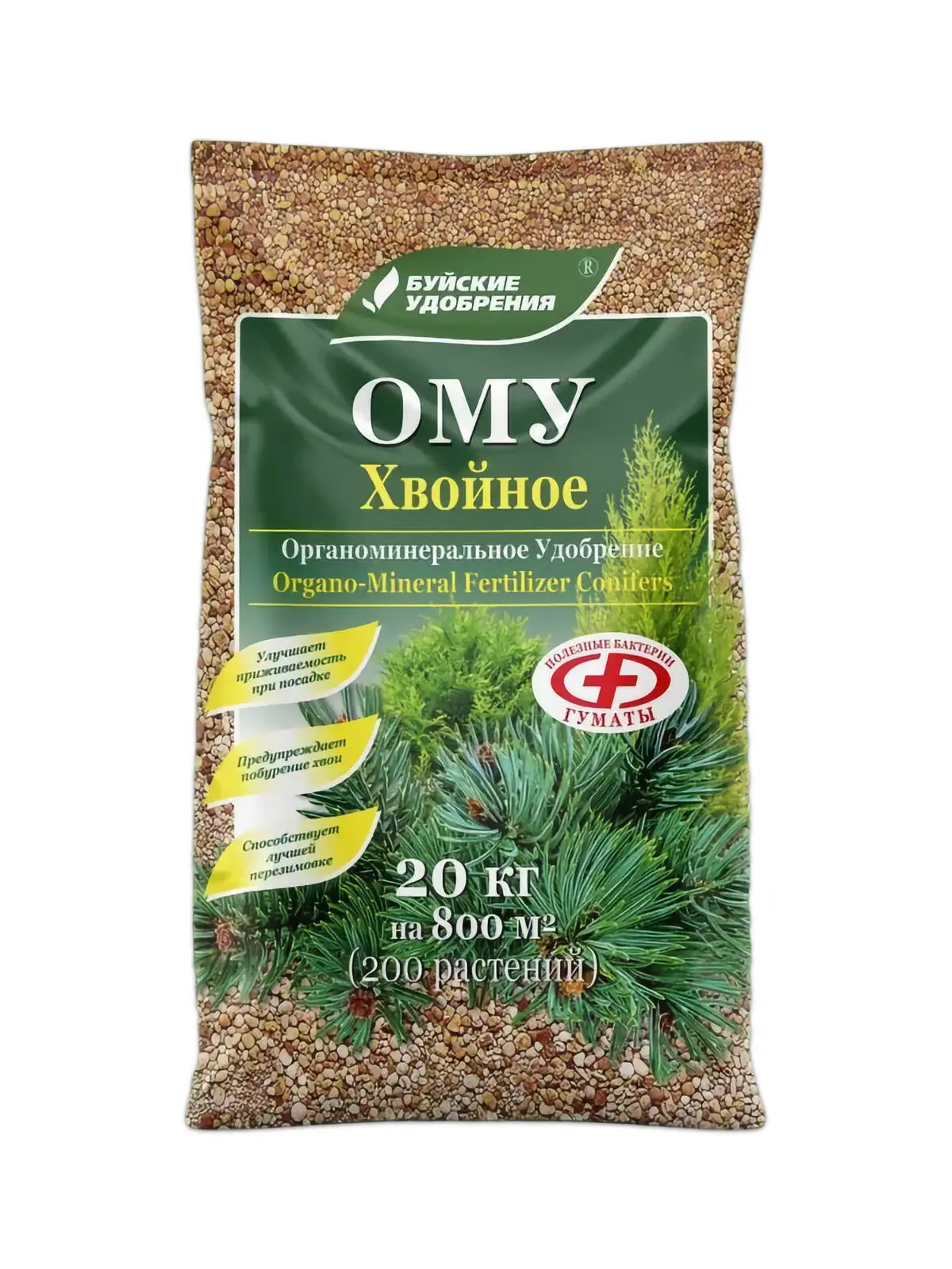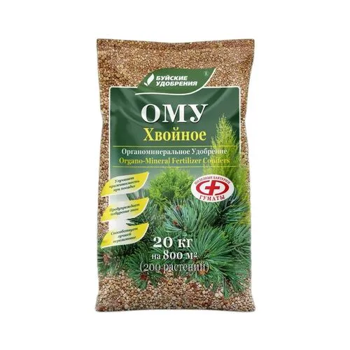 ОМУ Хвойное – комплексное органоминеральное гранулированное удобрение на основе соединений азота, фосфора, калия, серы и микроэлементов. Не содержит хлора и подобных для растений вредных веществ. Длительного действия. В процессе производства удобрения минеральные элементы взаимодействуют с гуминовыми соединениями и образуют органоминеральные комплексы. В них фосфор и калий находятся в форме, легко усвояемой растениями, а азот закрепляется и не вымывается. Эффективность использования таких комплексов достигает 95%.