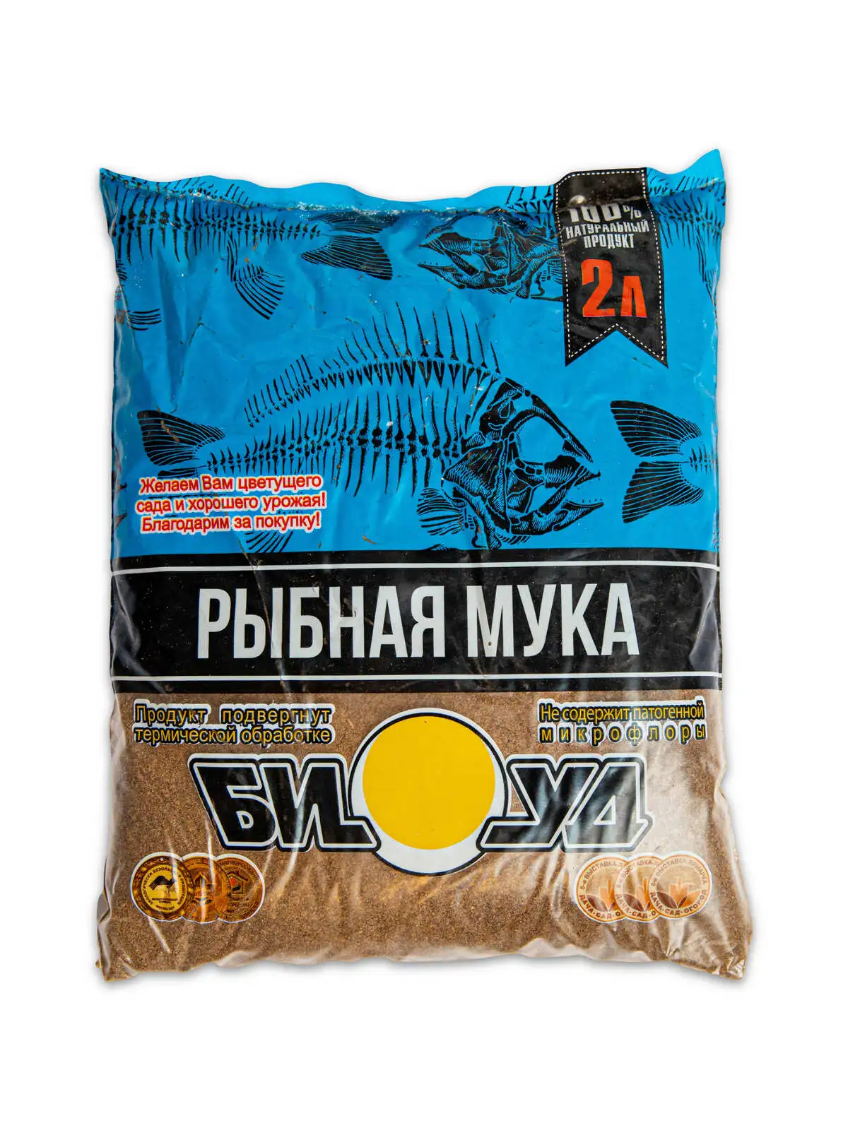 Удобрение рыбная мука БИУД, 2л. Сыпучий порошок мелкого помола, от светло-коричневатого до коричневого цвета. Натуральный продукт термической переработки и дробления скелета и костей рыб, морских млекопитающих, ракообразных и беспозвоночных - применим для органического земледелия, обладает высокопитательной основой, существенно улучшает структуру почв, активизируя жизнедеятельность почвенных микроорганизмов и червей кольчатых. Универсальное всесезонное удобрение с пролонгированным действием. Имея длительный процесс разложения в почве, равномерно питает корневую систему растений, положительно влияя на рост, цветение, плодоношение, улучшая вкусовые качества плодов. Незначительно понижает кислотность почв, подавляет жизнеспособность фитопатогенных микроорганизмов, грибов, снижает действие пестицидов и нитратов. Содержание питательных веществ не менее %: азота общего 4, фосфора 3 - 5, кальция 7 - 10, микроэлементы: йод, марганец, бор, железо и др. Протеин сырой - 40 - 50. Жир рыбий - 4 - 6. Кислотность ед. рН - 6, 5-7.