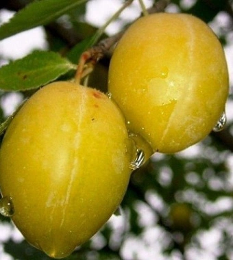 Плоды этого сорта имеют крупный размер и овальную форму. В среднем, их вес составляет 20 грамм. Кожура гладкая, светло желтая. Мякоть желтого цвета, сочная, сладкая. Косточка не отделяется от мякоти.