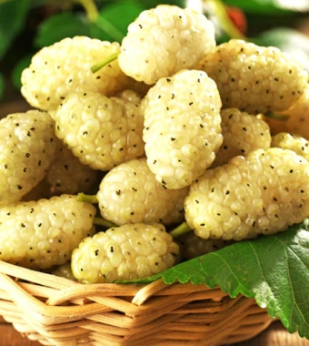 Плоды шелковицы сорта «Белая медовая» имеют форму яйца и размер от 2 до 4 см. Они имеют гладкую поверхность и напоминают по текстуре виноград. Цвет плодов может быть от желтовато-зеленого до ярко-оранжевого. Мякоть шелковицы сорта «Белая медовая» имеет сладкий вкус, напоминающий мед, отсюда и происходит ее название.