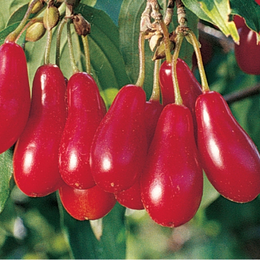 Плоды кизила грушевидного имеют овальную форму и достигают длины до 3 см. Кожура плода имеет ярко-красный цвет, мякоть – насыщенный ярко-красный. Плоды кизила грушевидного обладают кисло-сладким вкусом и ароматом, содержат большое количество витаминов С и РР, а также каротина и других полезных веществ.