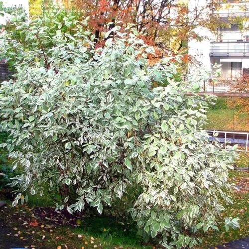Крона имеет округлую форму, она густая и раскидистая, а побеги блестящие и красноватые. Листья Сибирика Вариегата плотные, крупные, эллиптические и имеют несколько морщинистую поверхность. Они окрашены в темно-зеленый цвет с нежной белой каймой, маленькими пятнышками и полосочками в центре. Кустарник декоративен весь сезон благодаря необычной окраске летом и осенью.