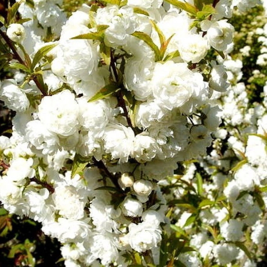 Миндаль декоративный Пленна - это кустарник, высотой до 2 метров. Листья у него крупные, овальной формы, темно-зеленого цвета. Цветы махровые, белого или розового цвета, диаметром до 5 см. Цветет кустарник в апреле-мае, цветение длится около 3-х недель.