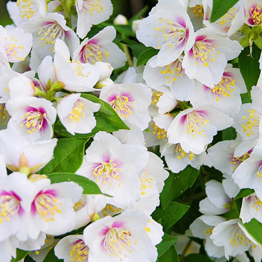У чубушника Сибилла соцветия имеют пучковидную, плотную форму. В одном соцветии формируются цветочки – 3-5 штук, достигающие в размере около 2 см, которые расположены друг от друга очень близко. Бутоны простые, но обладают эффектным двухцветным окрасом: розовое основание и белый край лепестка. Сорт источает сладкий аромат, распространяющийся на большое расстояние.