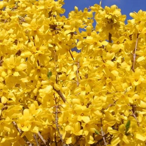 Это растение покрывается бутонами раньше, чем вырастает листва на других растениях. Форзиция промежуточная объединяет более 100 видов кустарников и деревьев. Этот кустарник отличается средними размерами, высотой от 100 до 300 см, поникшими ветвями и овальными листьями.