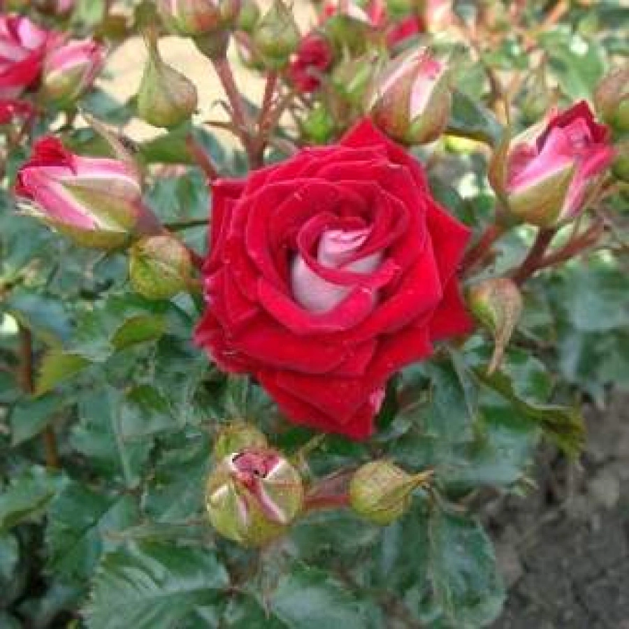 Роза Руби Стар создана в Нидерландах компанией Interplant, выращивается она на срезание и для контейнерного разведения, а также может расти группами кустов в цветниках, включая бордюрные палисадники. Цветок обладает тёмно-красной палитрой, но отличает его от других сортов белая прослойка. Основная окраска цветка – красные тона, цветонасыщенность относится к ярким. Двухцветность данного сорта обусловлена как раз наличием белой каймы, но цветки не признаются как «пестроцвет». По форме бутон относится к классическим, размеры (диаметр) его относительно мелкие, ниже средних: всего 4,5 см. По численности лепестков классифицируют как махровую культуру: 35-40 лепестков в каждом цветке. На стеблях цветки располагаются как многоцветковые соцветия: в каждом из них – в среднем 7 бутонов.